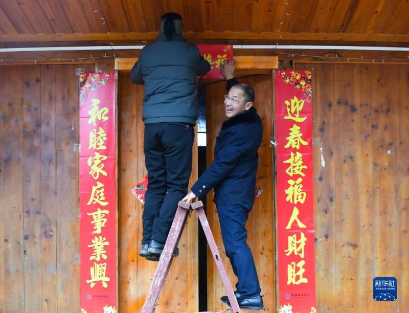 2021年2月5日,张忠富(右)在湖南省常德市石门县金河村脱贫户邓先鹤家中与他一起贴春联。新华社记者 薛宇舸 摄