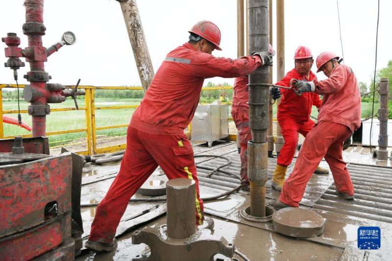 2019年6月27日,大庆油田1205钻井队队长张晶(右二)与工人们在进行作业。新华社记者 王建威 摄