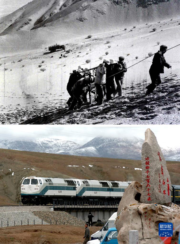 拼版照片:上图为20世纪50年代拍摄的勘测青藏线的资料照片;下图为2006年7月1日,青藏铁路全线通车。这是从格尔木出发的“青1”次列车经过海拔4767米的昆仑山口(新华社记者侯德强摄)。新华社发