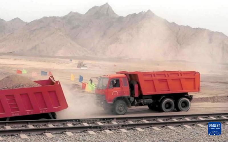 2001年6月29日,青藏铁路二期工程格尔木至拉萨段铁路正式动工修建。格尔木市南山口车站是格拉段铁路的起点。图为南山口施工现场。新华社记者 高学余 摄