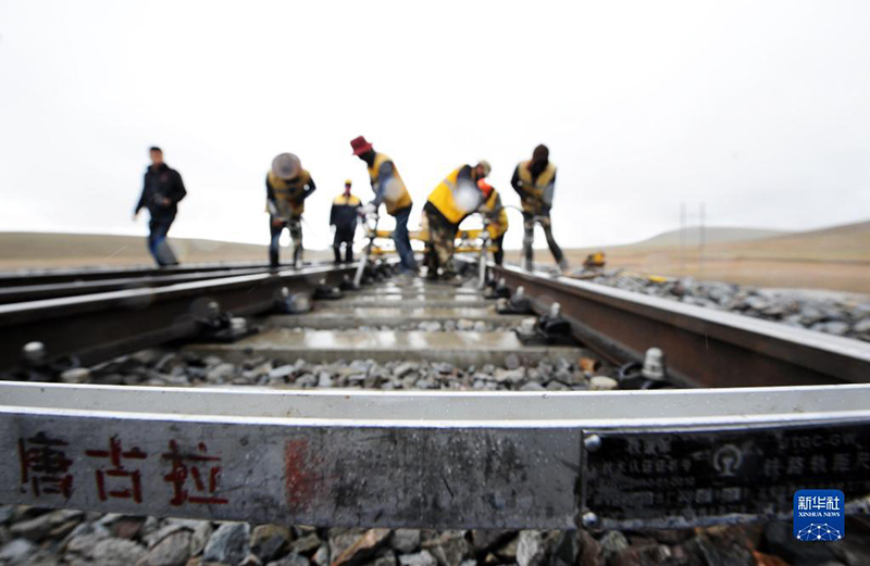 2018年6月30日,在青藏铁路唐古拉站附近,养路工人冒雨对路轨进行捣固作业。新华社记者 侯德强 摄