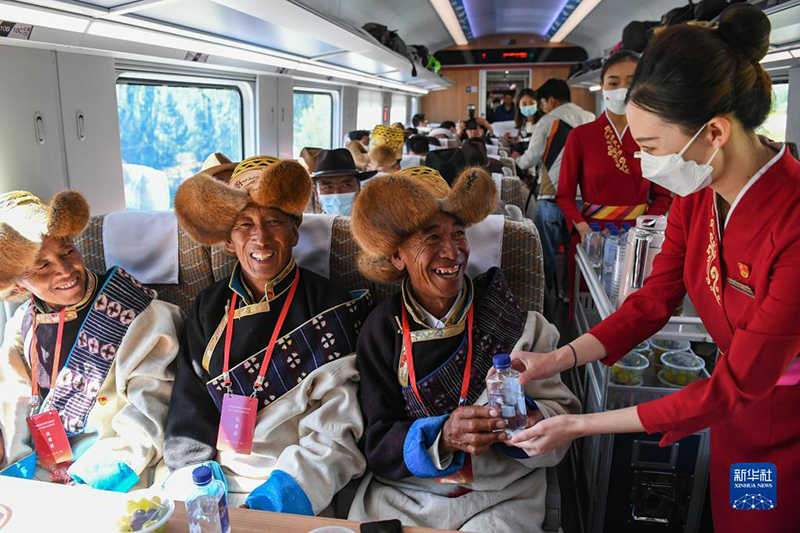 2021年6月25日,全长435公里、设计时速160公里的拉林铁路建成通车,西藏首条电气化铁路建成,同时复兴号实现对31个省区市全覆盖。这是6月25日列车员向乘坐首趟复兴号高原内电双源动车组的乘客递水。新华社记者 普布扎西 摄