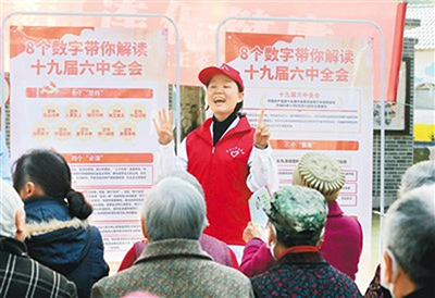 11月18日,江苏省海安市大公镇党员志愿者在常河村向村民宣传党的十九届六中全会精神。 翟慧勇摄(人民视觉)