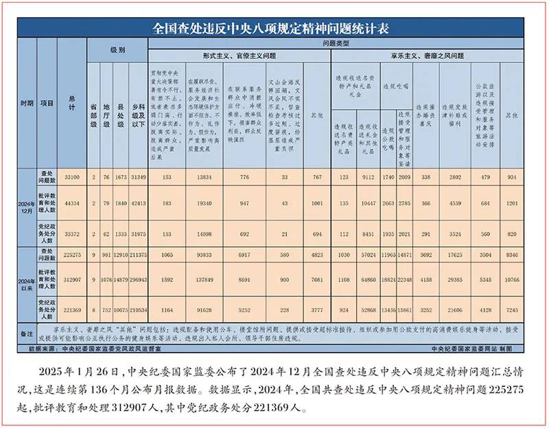 2024年,全国纪检监察机关共接收信访举报356.3万件次,处置问题线索217.5万件,立案87.7万件,处分88.9万人,运用“四种形态”批评教育和处理214.8万人次……