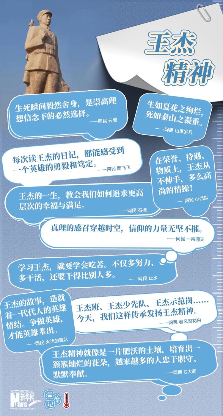 多少年来,王杰精神被广为传颂,他的故事造就着一代代人的英雄情结。如今,无论在军营还是在地方,处处都能看到王杰精神的发扬光大,正如网民所说,“王杰精神就像是一片肥沃的土壤,培育出一簇簇灿烂的花朵,越来越多的人忠于职守、默默奉献”。“一不怕苦、二不怕死”,一个响亮的口号,一种永不褪色的精神,正激励着我们在新时代的征途上阔步前进!(文字:马若虎 海报设计:王晔)