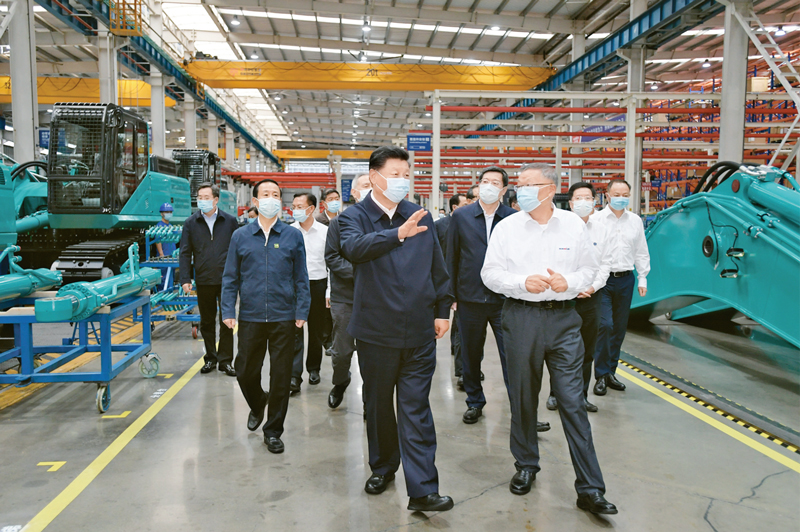 2020年9月16日至18日,中共中央总书记、国家主席、中央军委主席习近平在湖南考察。这是17日下午,习近平在长沙市山河智能装备股份有限公司生产车间,察看装备制造流程,了解技术研发、生产制造情况。新华社记者 李学仁/摄