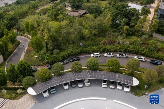 2022年6月16日拍摄的已建成投用的重庆首座光伏充电发用一体充电站(无人机照片)。新华社记者 刘潺 摄
