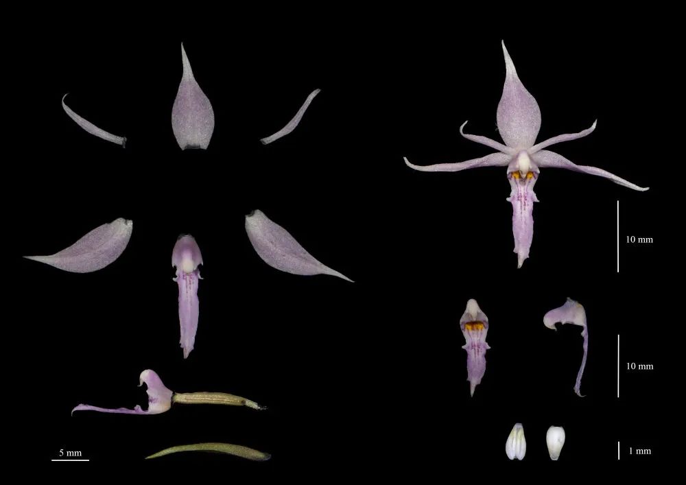 图片2023年8月12日拍摄的盈江虾脊兰解剖图。(翟俊文摄)