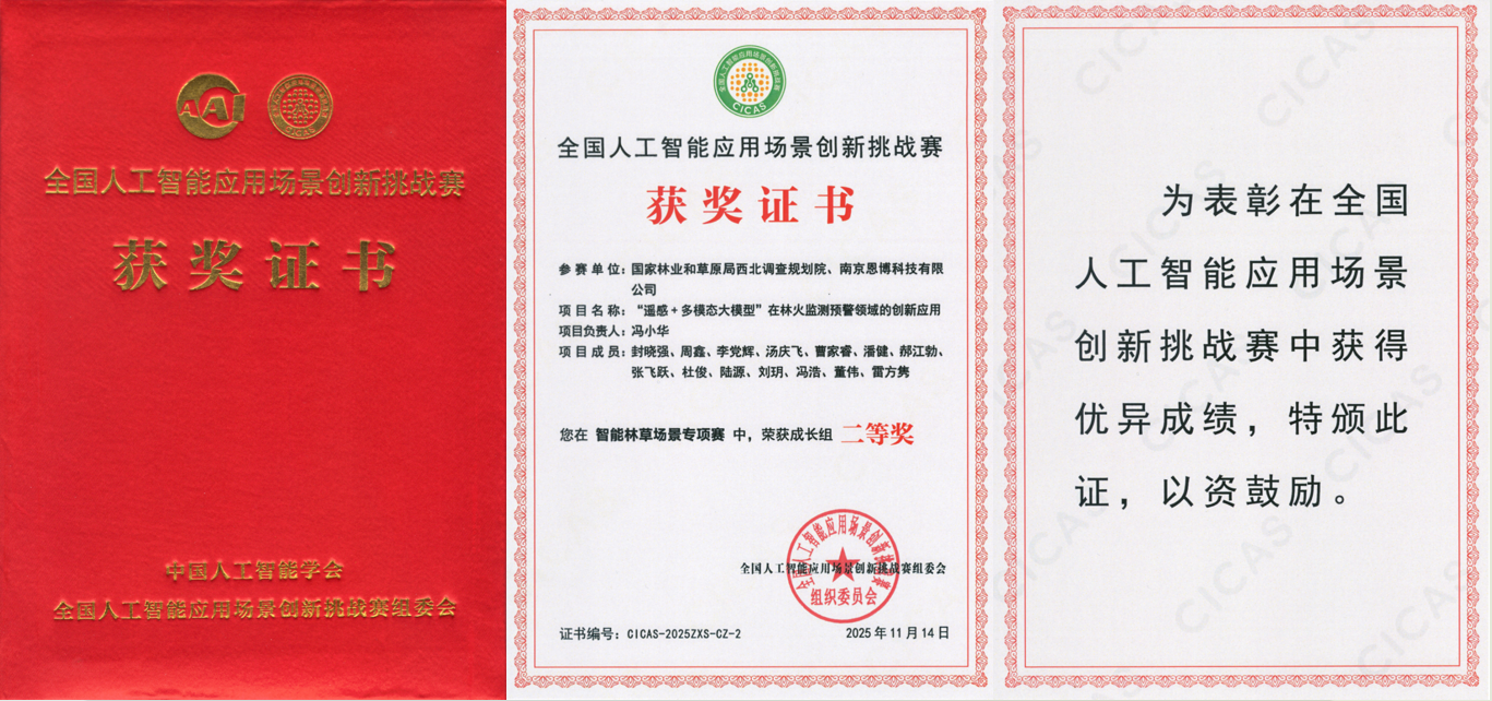 近日,2025第三届全国人工智能应用场景创新挑战赛(CICAS)智能林草专项晋级赛在山东淄博落幕。我院联合团队凭借“‘遥感+多模态大模型’在林火监测预警领域的创新应用”项目,历经网络选拔、路演答辩等多轮激烈角逐,最终荣获挑战赛成长组二等奖。