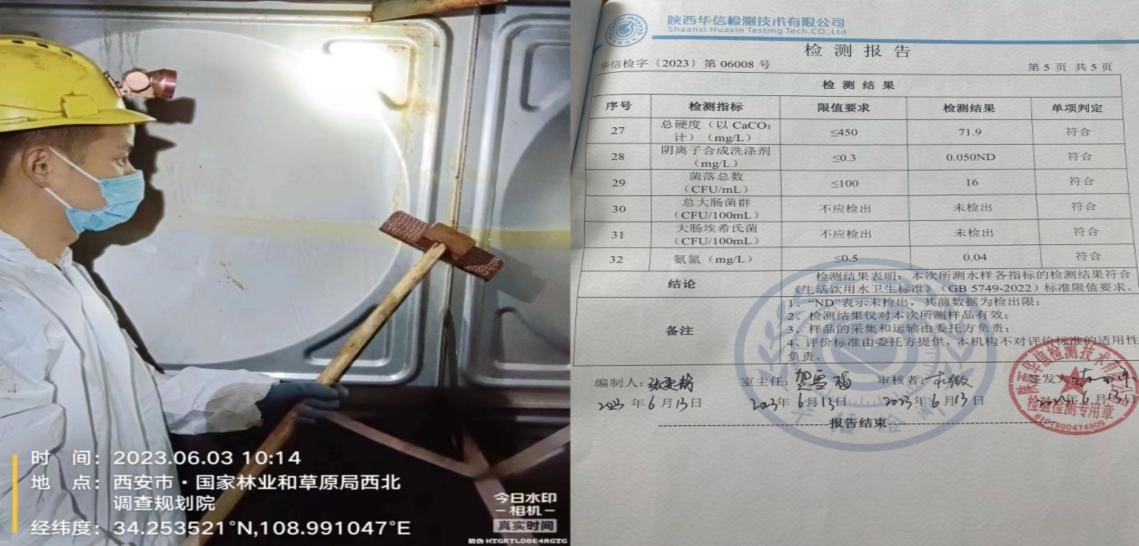 院后勤处聘请了西安透丽科技发展有限公司对2座蓄水箱进行清洗消毒,历时近5个小时完成二次供水设施全部消毒清洗并恢复正常供水,经专业检测机构鉴定,院送检水样的各项指标均符合标准。