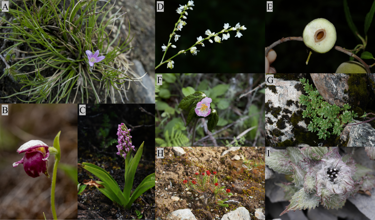 科考发现的保护区部分珍稀保护植物:A芒苞草,B紫花杓兰,C西南手参,D金荞麦,E光核桃,F桃儿七,G大花红景天,H长鞭红景天,I水母雪兔子