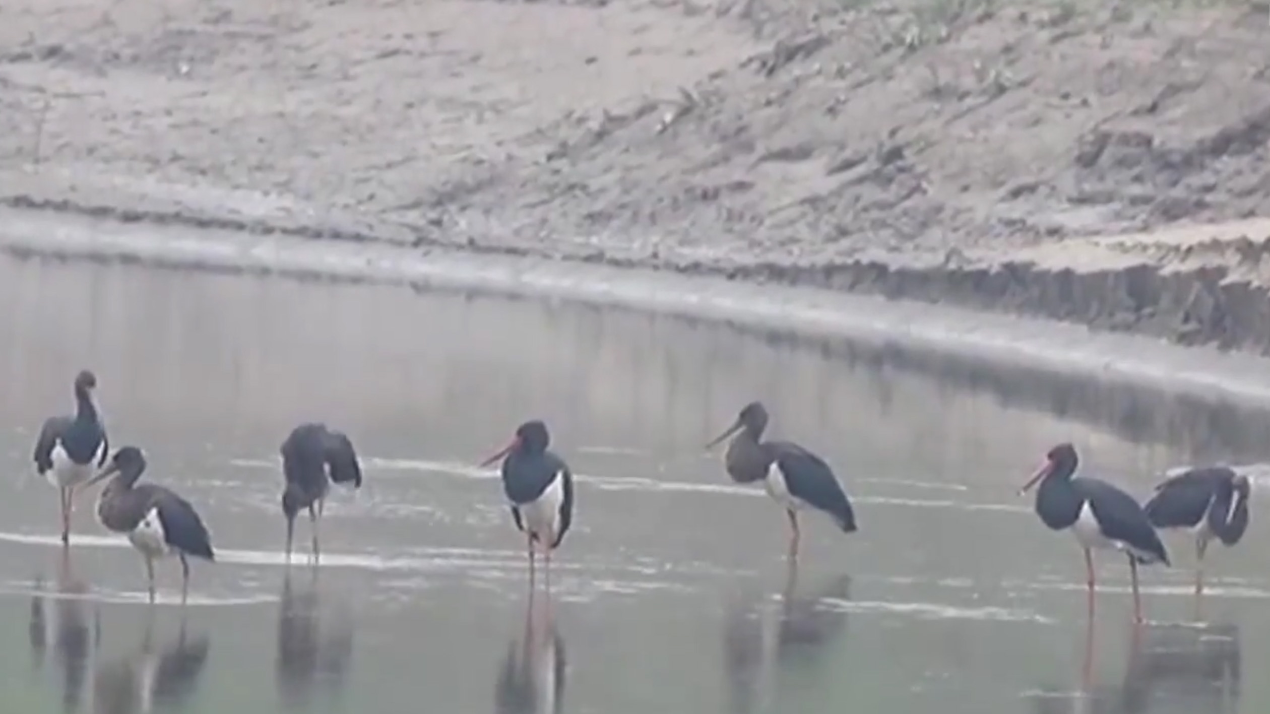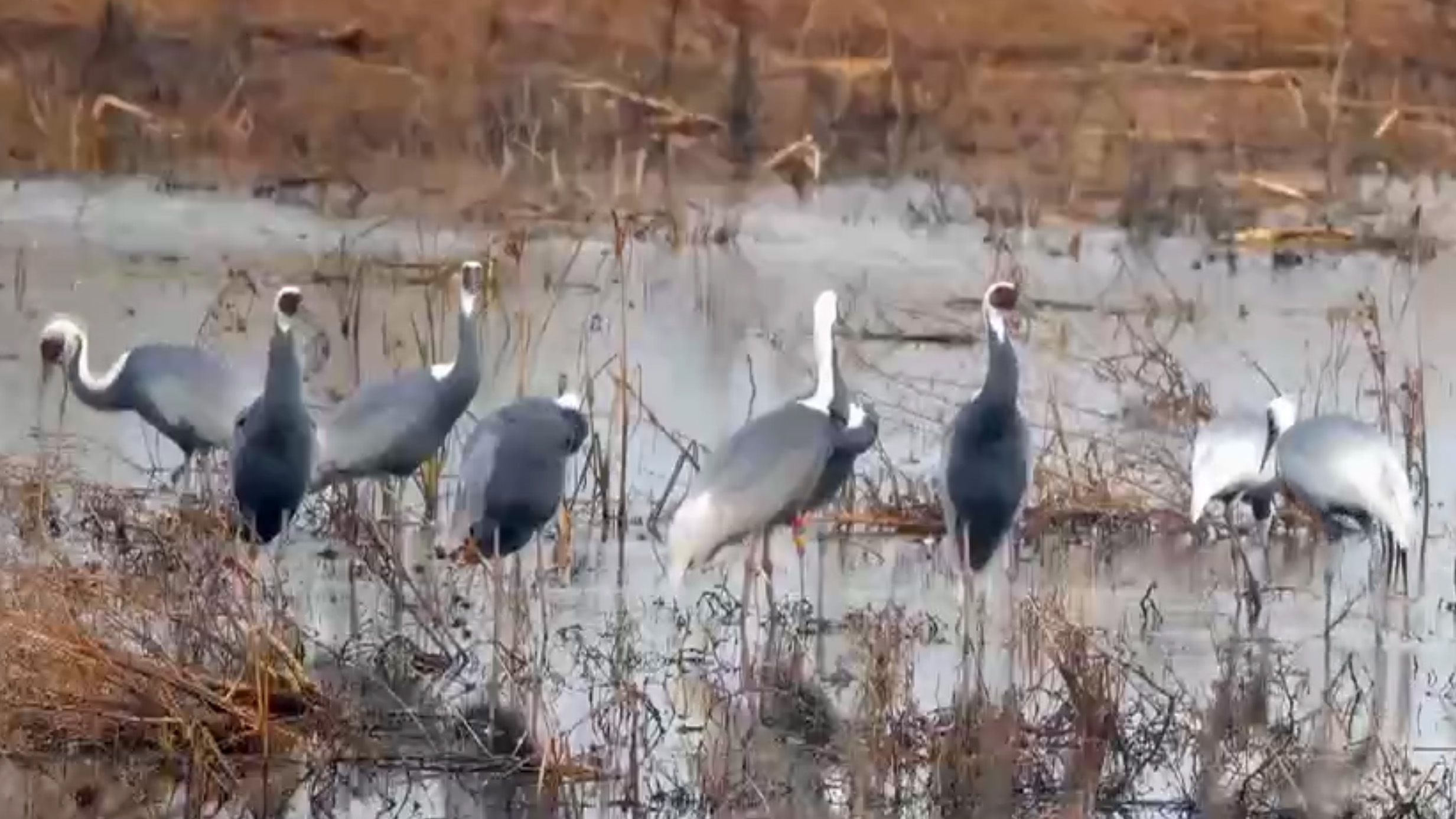 湖北阳新:濒危珍禽白枕鹤群飞抵网湖湿地