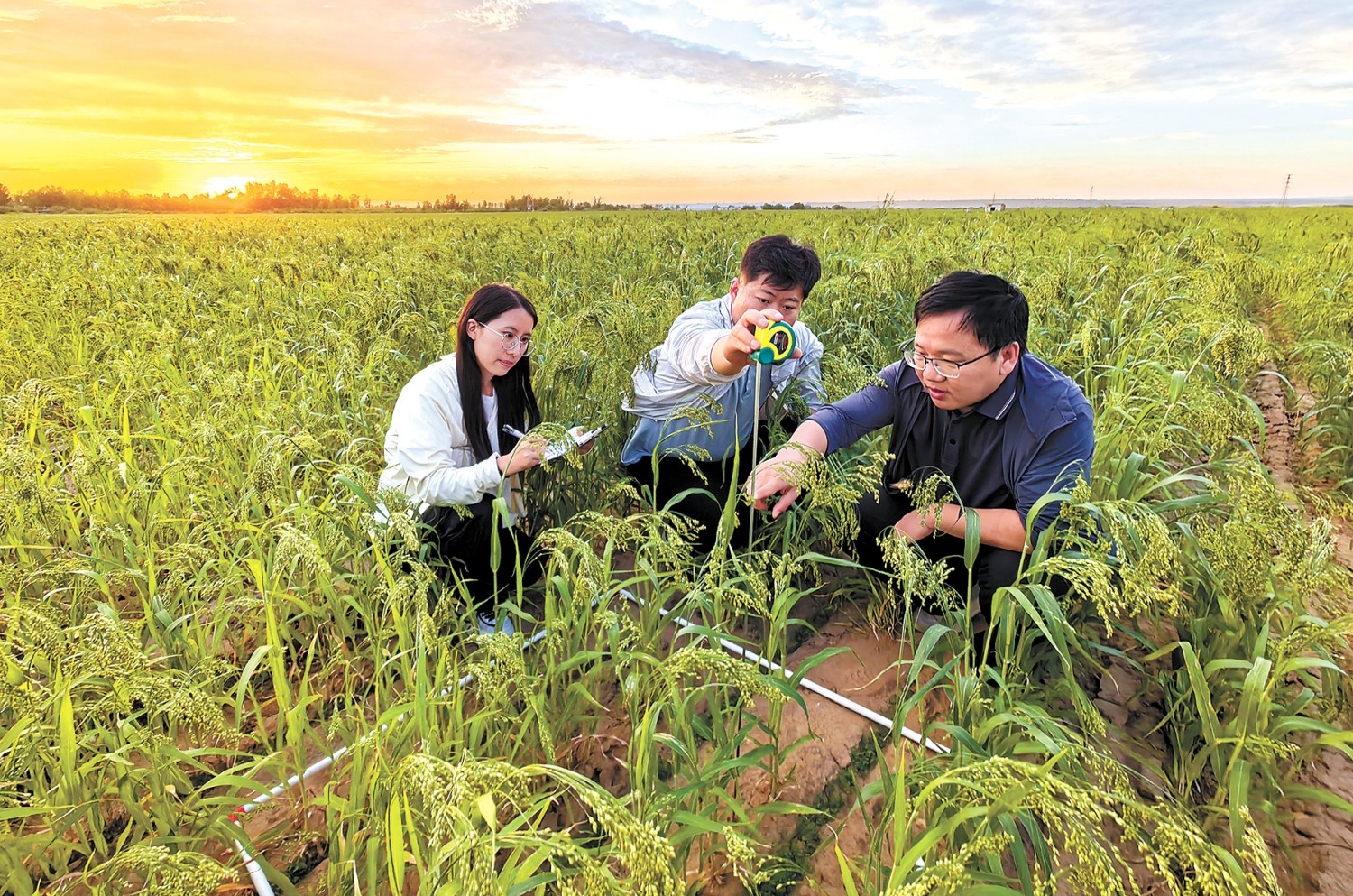 “这个巧办法叫作‘以禾带豆’。”李伟说,他们研究发现,像糜子这样的一年生禾本科植物,在盐碱沙地能够轻松破除地表的物理结皮而出苗,如果借用糜子出土的裂缝让豆科类的优质牧草也探出头来,再借用糜子如树林般的高大身躯遮风挡沙,庇护新苗,盐碱沙地里长出好牧草就不再是幻想了。