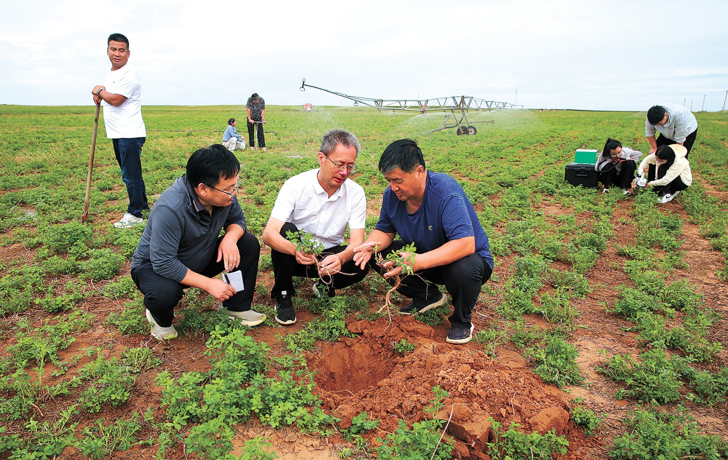 魏孝荣研究员(前排中)与定边县宏勃农业发展有限公司负责人陈学军在查看盐碱沙地苜蓿根生长情况