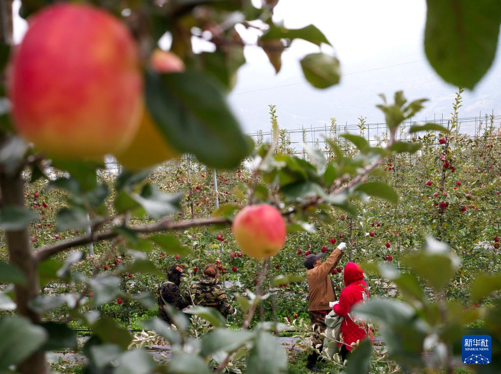 11月18日,在四川茂县九顶农牧苹果园里,村民在采收苹果。