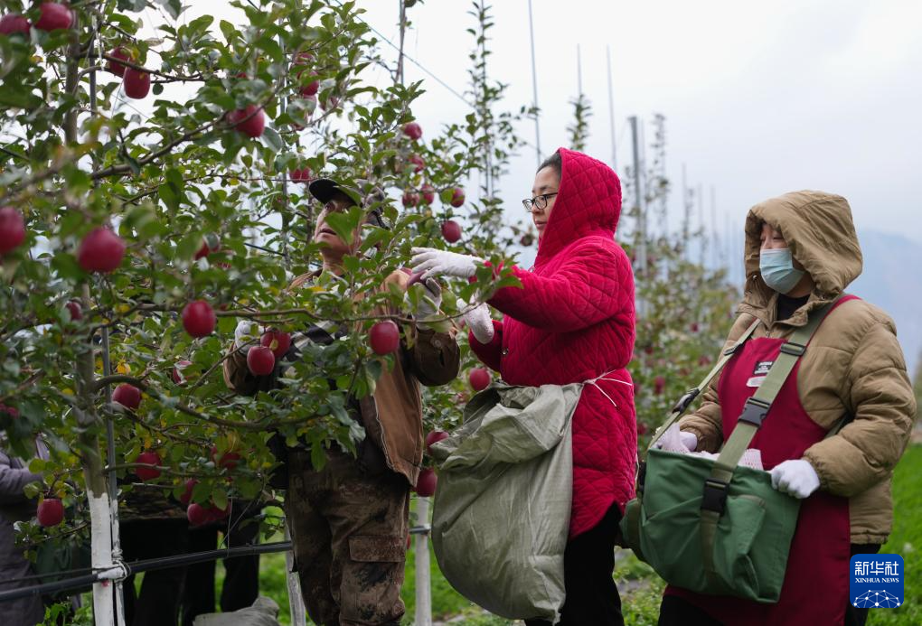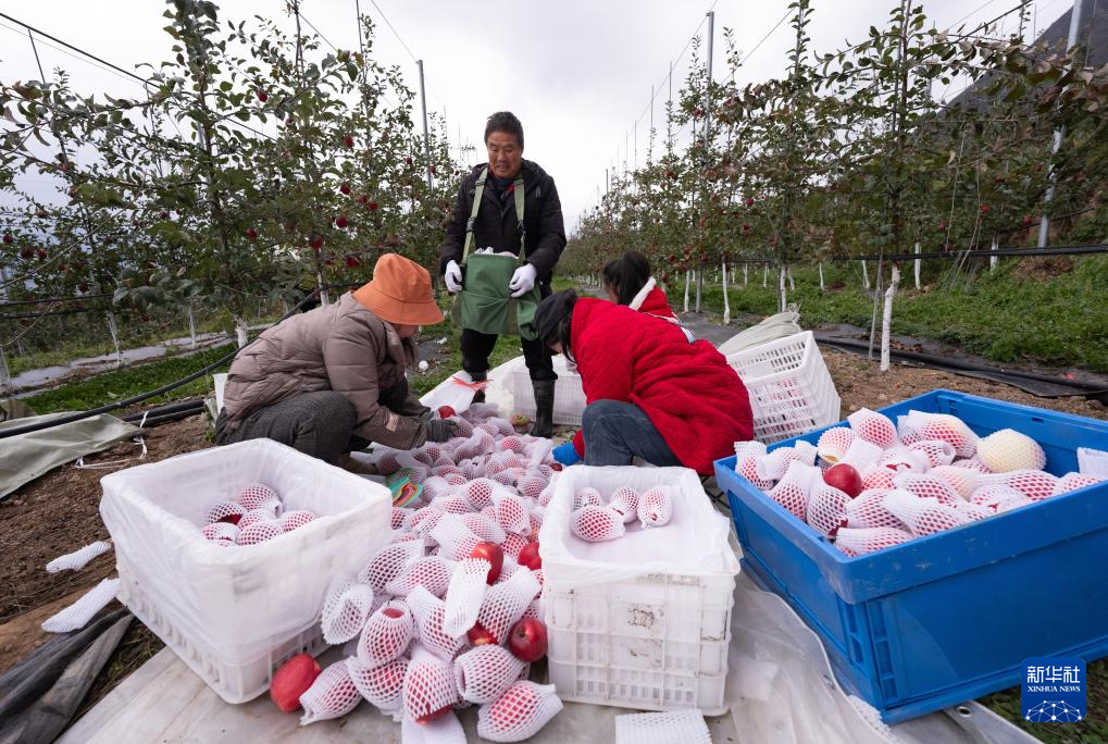 11月18日,在四川茂县九顶农牧苹果园里,村民一边采摘,一边为苹果套保护套。新华社记者 江宏景 摄