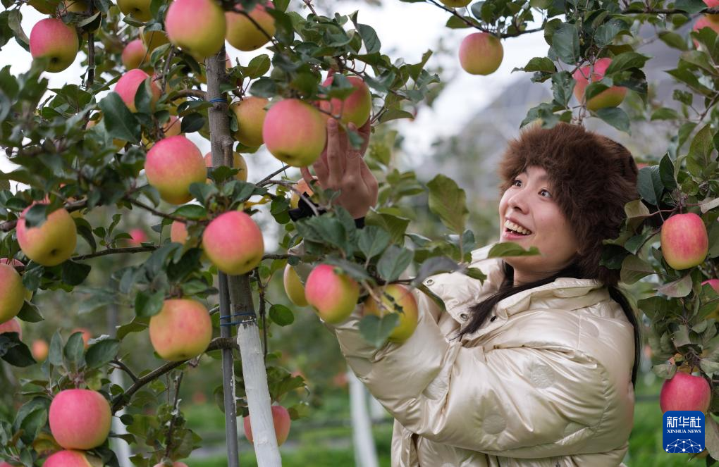 11月18日,在四川茂县九顶农牧苹果园里,一名来自成都的游客体验苹果采摘。新华社记者 江宏景 摄