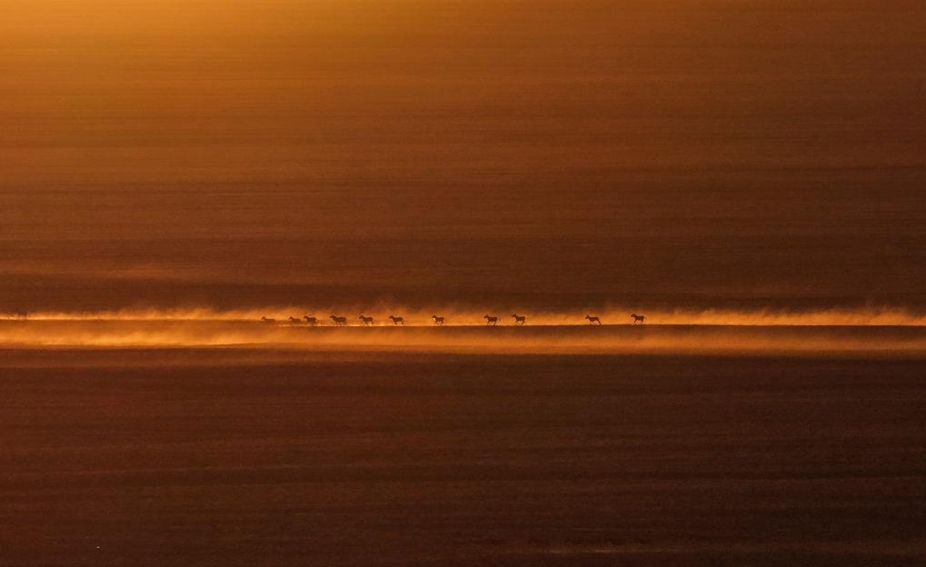 在阿尔金山国家级自然保护区,藏野驴奔跑在日出时的依协克帕提草原上(无人机照片,12月9日摄)。新华社记者 辛悦卫 摄