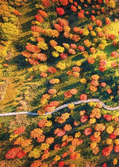 秋末冬初,池杉湖国家湿地公园内层林尽染。来安县委宣传部供图