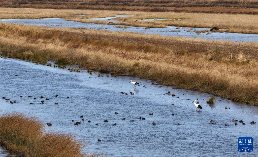10月14日在黑龙江省同江市三江口国家湿地公园拍摄的东方白鹳和野鸭(无人机照片)。新华社发(刘万平摄)