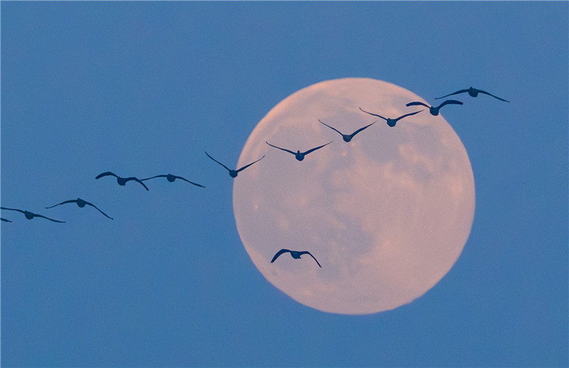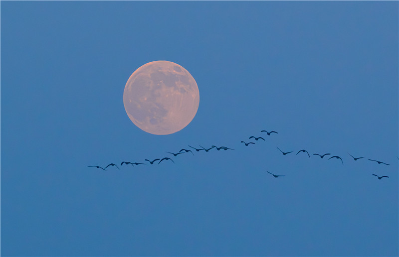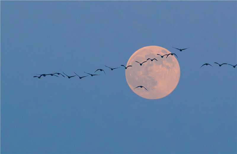 11月5日,本年最大的“超级月亮”现身夜空。在安徽省霍山县东淠河上空,摄影师成功捕捉到大雁飞过这一壮观天体的画面。适逢候鸟迁徙高峰,大批南迁候鸟在此停留,为这一难得景象提供了自然条件。