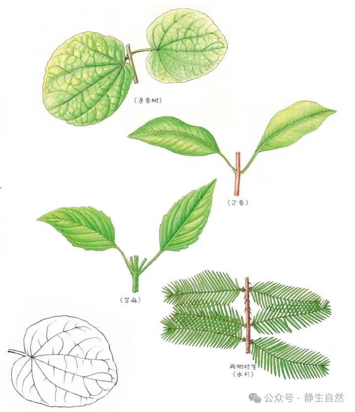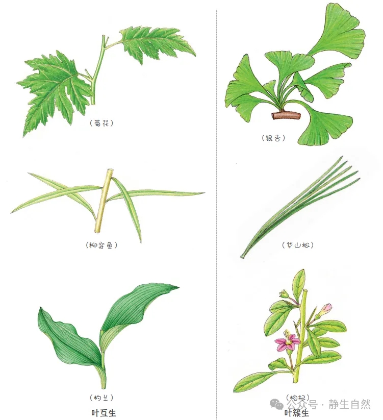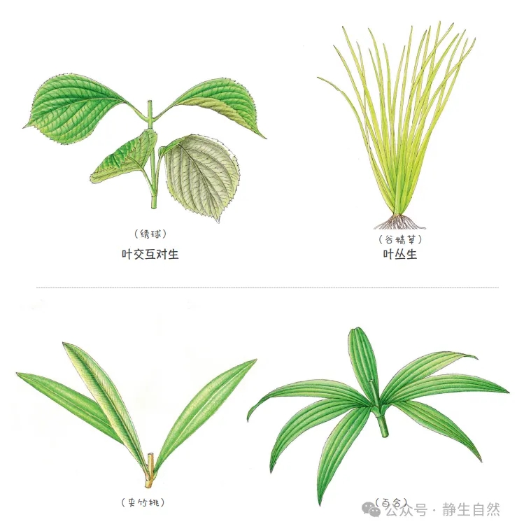 有的叶在茎枝的上下交错开一定的角度生长,一般交叉排列成直角,形成十字形交叉,这是交互对生,例如绣球、地笋等。
