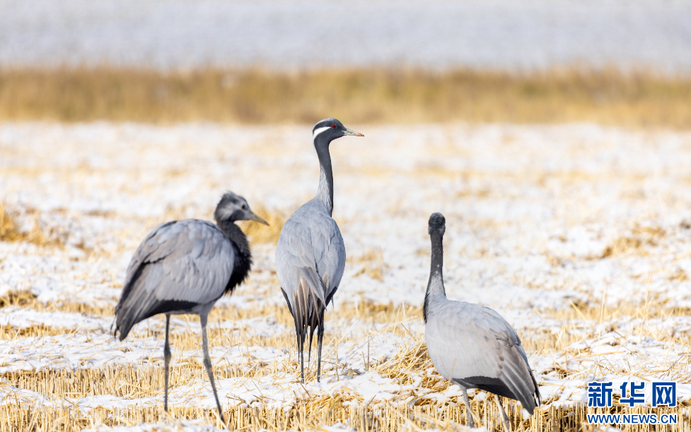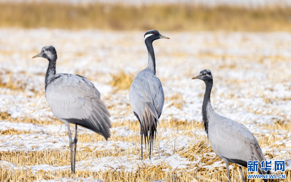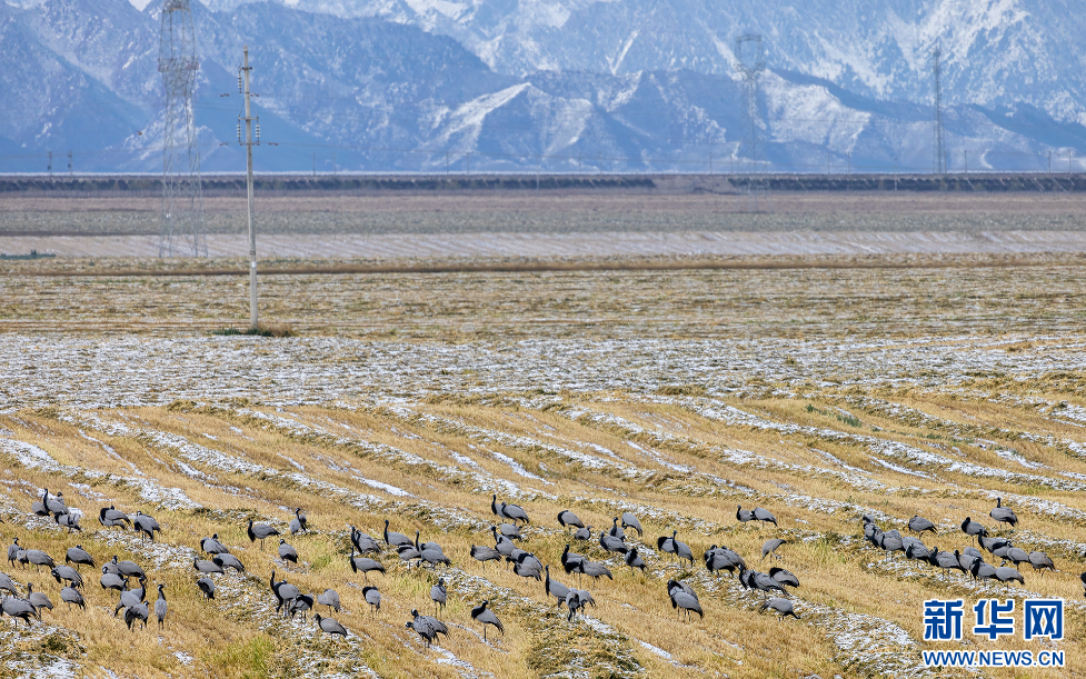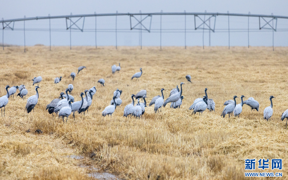 近日,200余只国家二级保护动物蓑羽鹤现身位于甘肃省张掖市的山丹马场二场。蓑羽鹤对栖息地要求严苛,这里收割后的大麦田地和燕麦草地为其迁徙提供了“补给站”和休憩地。新华网发(赵锐 摄)