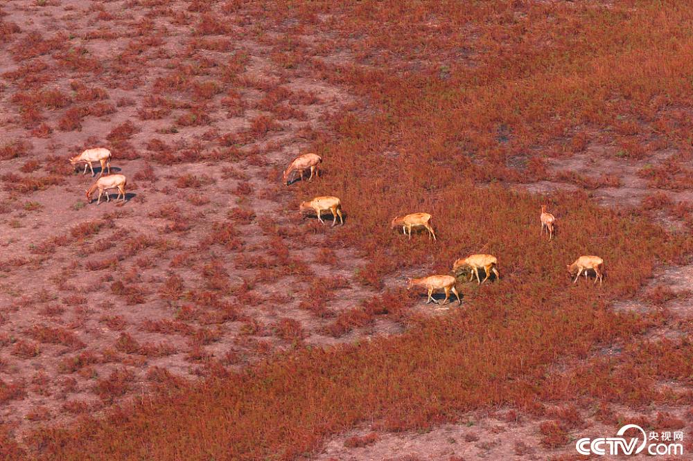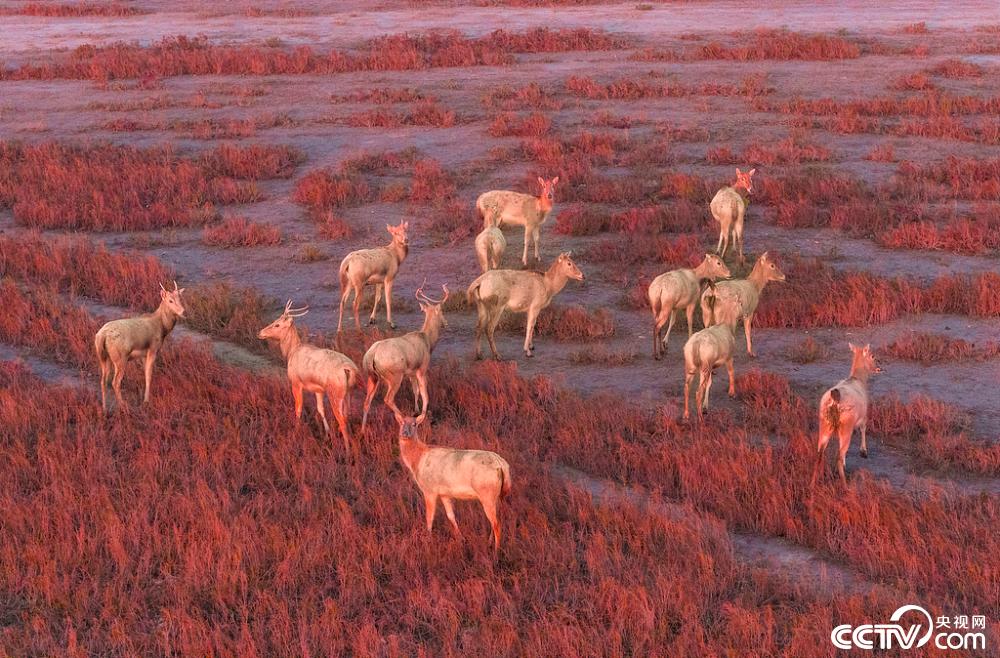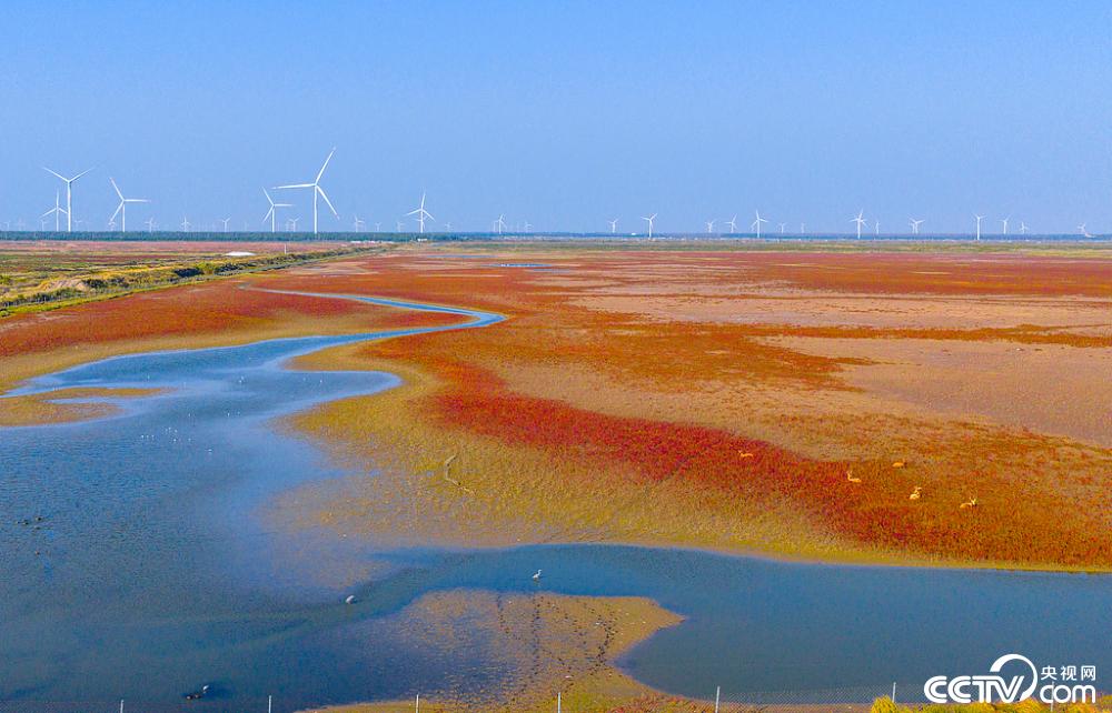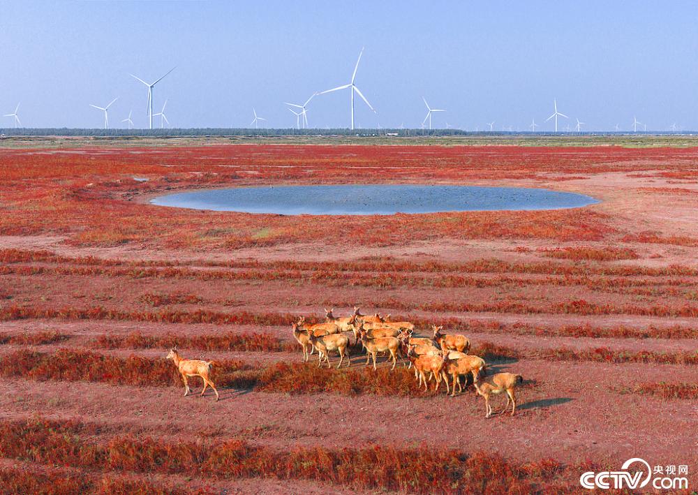 10月28日,江苏省盐城市东台条子泥湿地,碱蓬草铺就的“红地毯”绵延无际。这片被称作“红海”的滩涂之上,一群麋鹿穿梭奔跑,湿地浅塘与远处风电设施相映成趣。视觉中国