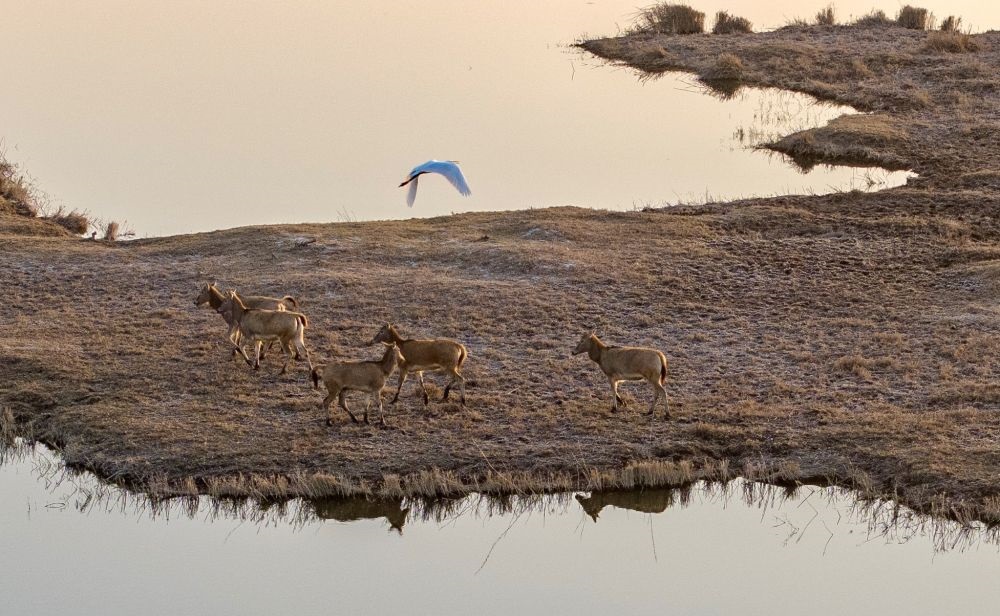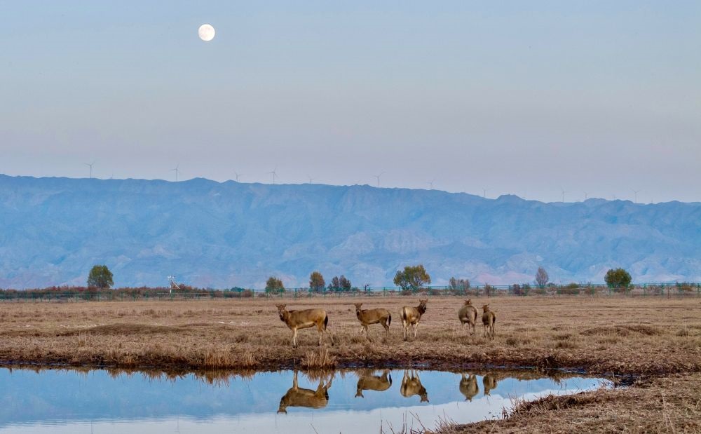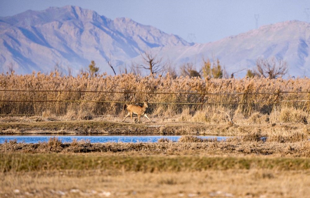 青铜峡库区湿地自然保护区总面积174.93平方公里,是宁夏最大的黄河滩涂类型湿地。2024年9月底,35头麋鹿落户青铜峡库区湿地自然保护区,经过一个月适应期后被野放在200余亩的围栏内。目前,随着6只麋鹿幼崽的诞生,当地麋鹿种群繁育工作迈入新阶段,放归区域从200余亩扩展至3000余亩,保护工作也从迁地扩繁转向野化放归,开启了黄河流域宁夏段生物多样性保护的新篇章。 新华社记者 杨植森 摄