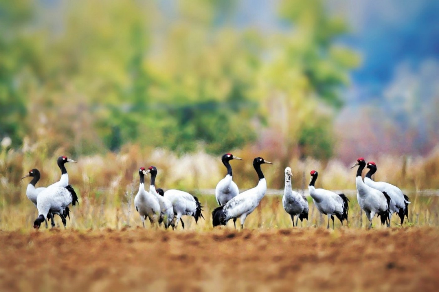 贵州草海国家级自然保护区是“高原神鸟”黑颈鹤的主要越冬地。每年11月,成群结队的黑颈鹤长途跋涉,如期而至。截至11月底,草海监测到黑颈鹤2000多只、灰鹤1000多只,还有斑头雁、骨顶鸡、赤麻鸭、鸬鹚、苍鹭、白鹭等鸟类共3万余只。它们或直上云霄,或临水而立,成为一道动人的风景线。(陈仁凯)