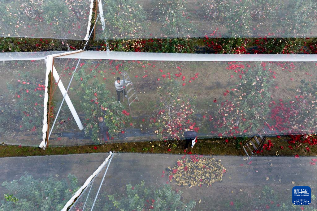 10月17日,果农在延安市宝塔区桥沟街道烟洞沟村苹果园内摘掉苹果套袋(无人机照片)。新华社记者 邵瑞 摄