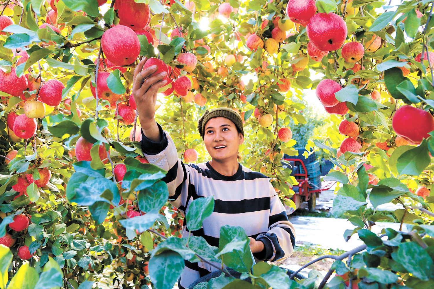 近日,新疆维吾尔自治区阿克苏地区阿瓦提县塔木托格拉克镇1.08万亩“冰糖心”苹果迎来采摘季。