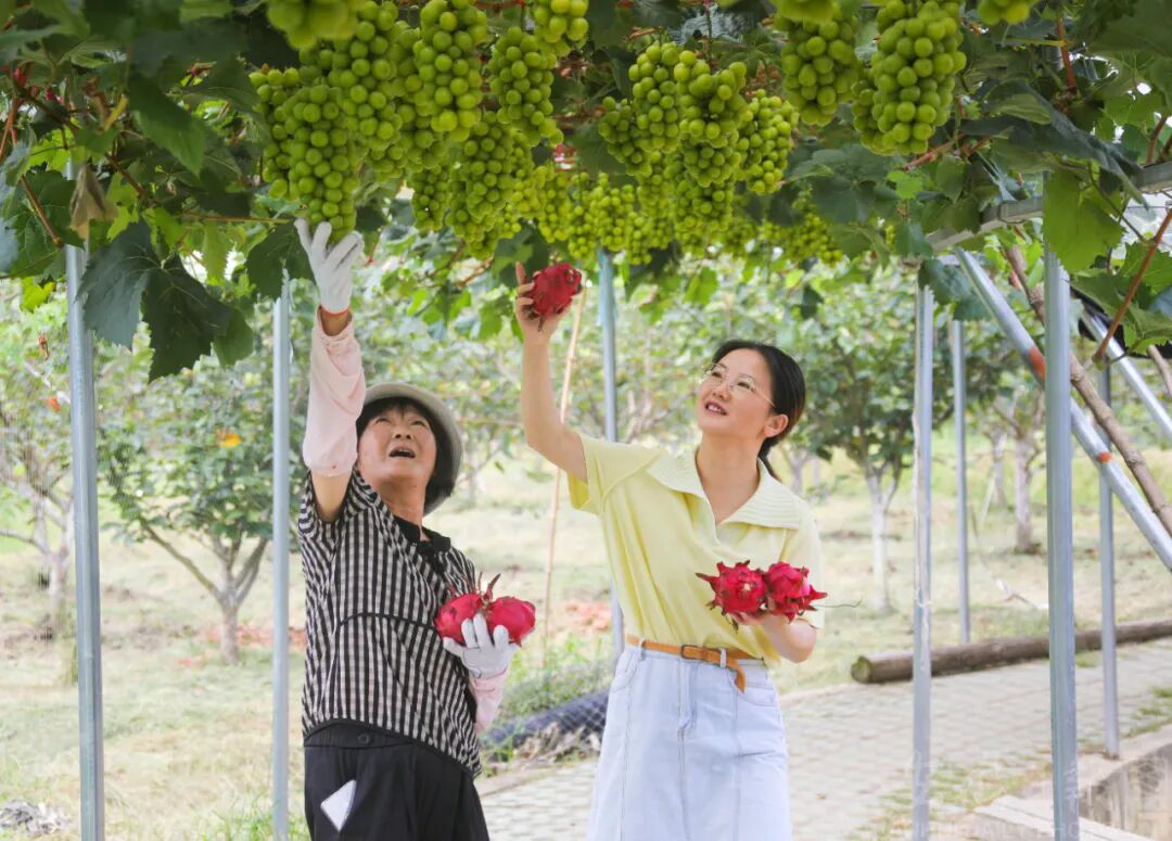 安庆市岳西县莲云乡关畈村青沐农场,游客采摘火龙果、阳光玫瑰葡萄等水果。熊凤霞/摄