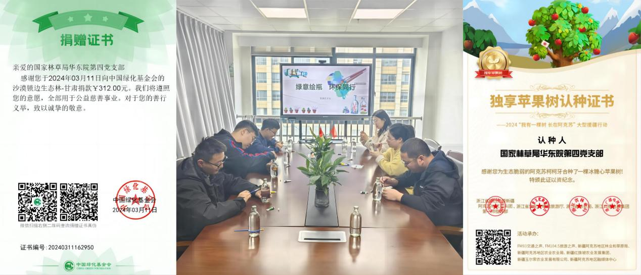 同时,第四党支部还带领信息技术处全体职工响应国家扶农助农、乡村振兴和推进共同富裕的号召,参与“我有一棵树 长在阿克苏”大型援疆公益项目,以支部名义种植一株苹果树,助力新疆植树护绿;开展“绿意绘瓶 环保同行”活动,描绘林草人心中的美丽中国,以进一步营造植树节文化氛围,增强全体职工生态环境保护意识。