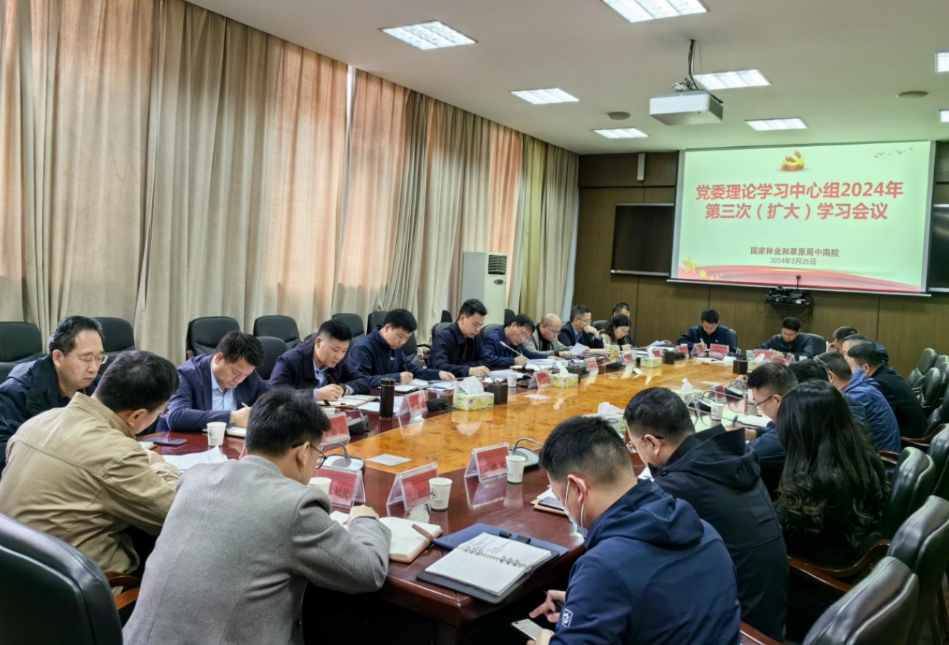 3月25日,国家林草局中南院党委理论学习中心组(扩大)召开2024年第三次集中学习,党委书记、院长周学武主持会议并总结讲话,院领导班子成员、党委委员和各处室(中心、公司)负责人参加学习。