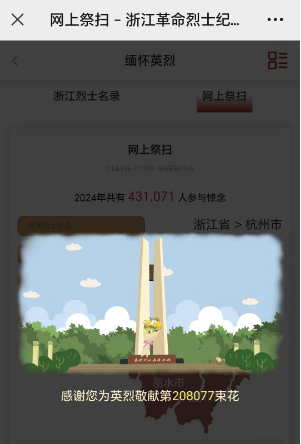 支部全体党员干部借助浙江革命烈士纪念馆官方网站和纪念馆微信公众号等平台,在“铸魂2024·网上祭英烈”活动专题页面,向烈士献花、鞠躬、抒写感言寄语,并通过线上祭奠方式深切缅怀先烈,寄托哀思。