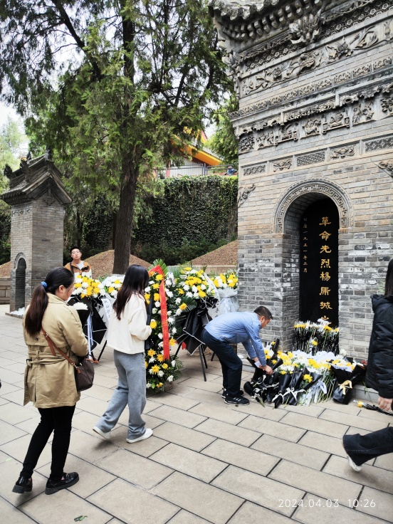 活动现场,全体党员在瞻仰烈士陵墓并献花篮挽联时,神情肃穆,鞠躬默哀,并逐一献上鲜花,表达了对杨虎城将军的崇高敬意和深切怀念,展现出了高度的纪律性和爱国情怀。