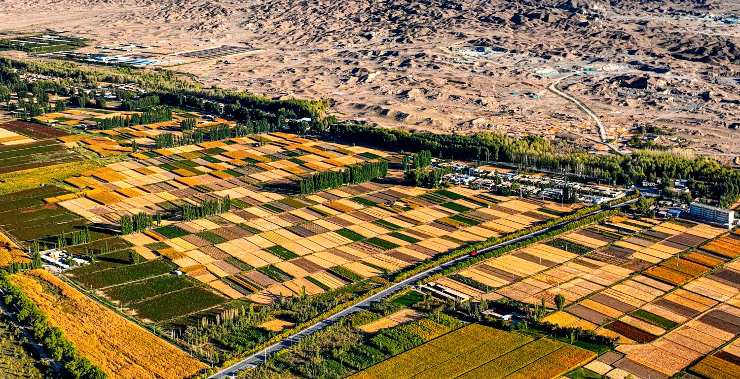 鸟瞰甘肃省张掖市高台县北部,“三北”防护林网似一道道屏障,阻挡了肆虐的风沙和荒漠,屏障内百万亩的农作物已到了收获的季节。