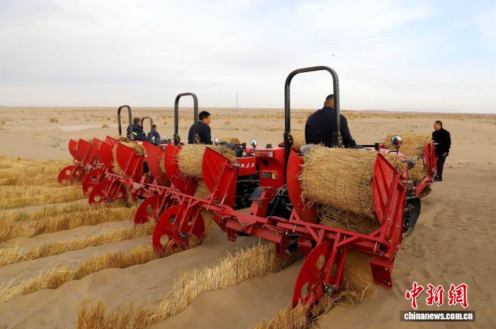 10月底,甘肃省武威市民勤县采用自走式草方格沙障机械设备,治沙效率显著提高。荣小勤 摄