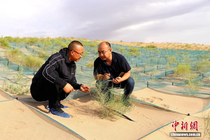图为民勤县技术人员监测可降解拦沙网内沙生植物的成活情况。(资料图)马爱彬 摄