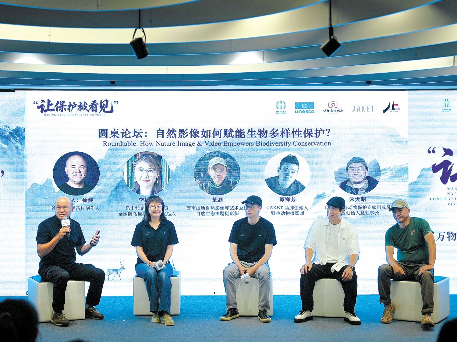 在由缤纷自然纪录片制作人徐健主持的“自然影像如何赋能生物多样性保护”圆桌讨论环节,多位嘉宾从专业角度探讨如何发挥影像推动自然保护的力量,呼吁更多摄影师、保护机构、企业加入行动,共同用影像推动保护。西南山地自然影像库艺术总监董磊曾被一窝豺因咬死牲畜而被吊在桥上的场景所震撼。他指出:“影像不能只展示美,更应推动意识和行为的改变。”宋大昭表示,保护离不开公众支持,影像比文字更易引发共情和思考,应探索保护影像的生产标准,推动行业的共识和进步。知名服装品牌JAKET创始人谭祥芳分享了商业与保护结合的经验,他表示,企业投入自然保护与社会责任看似“亏钱”,但实际吸引了相同价值观的人才和消费者,让品牌更健康、更富生命力。