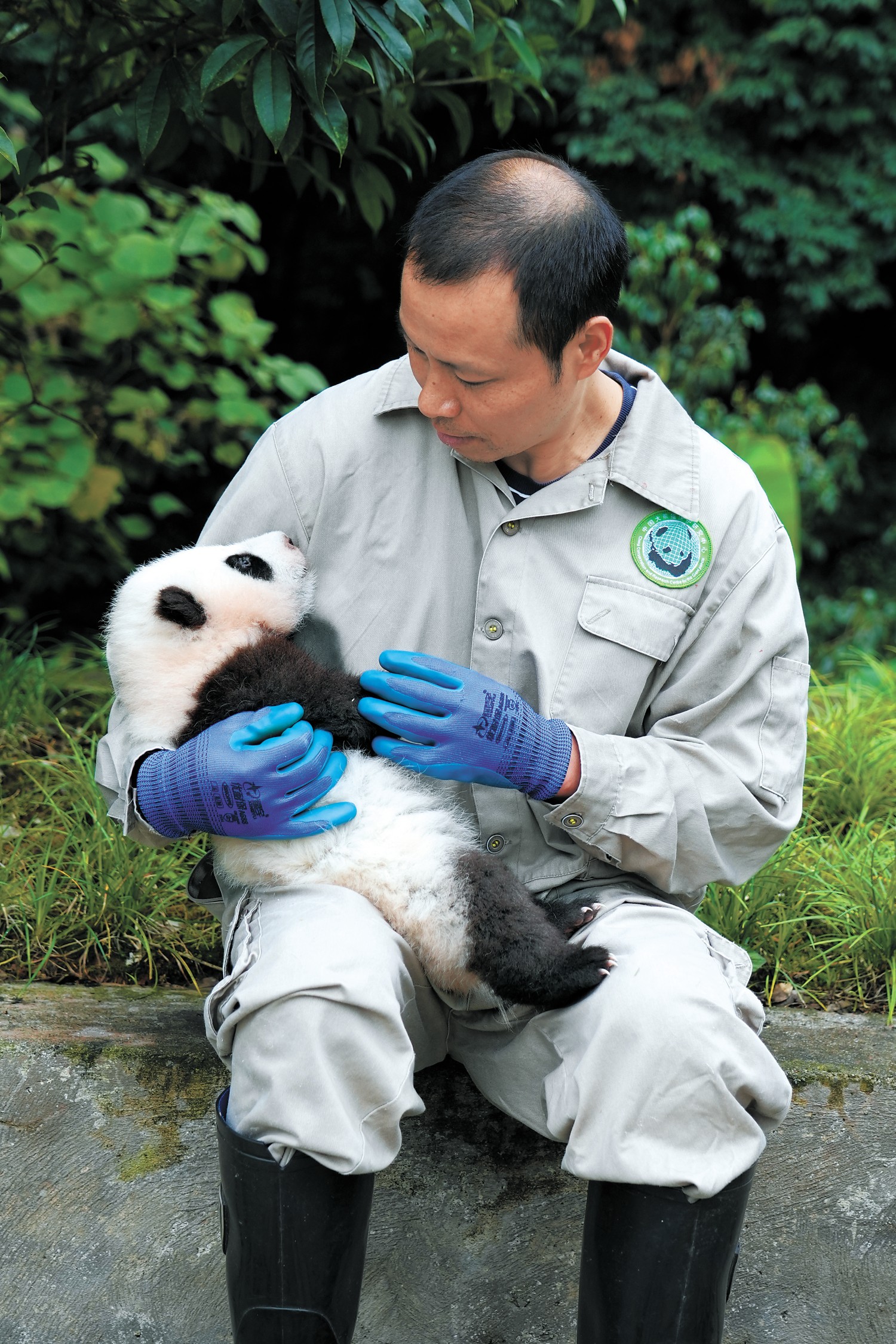 阎水健准备为大熊猫幼崽做日常检查。中国大熊猫保护研究中心供图