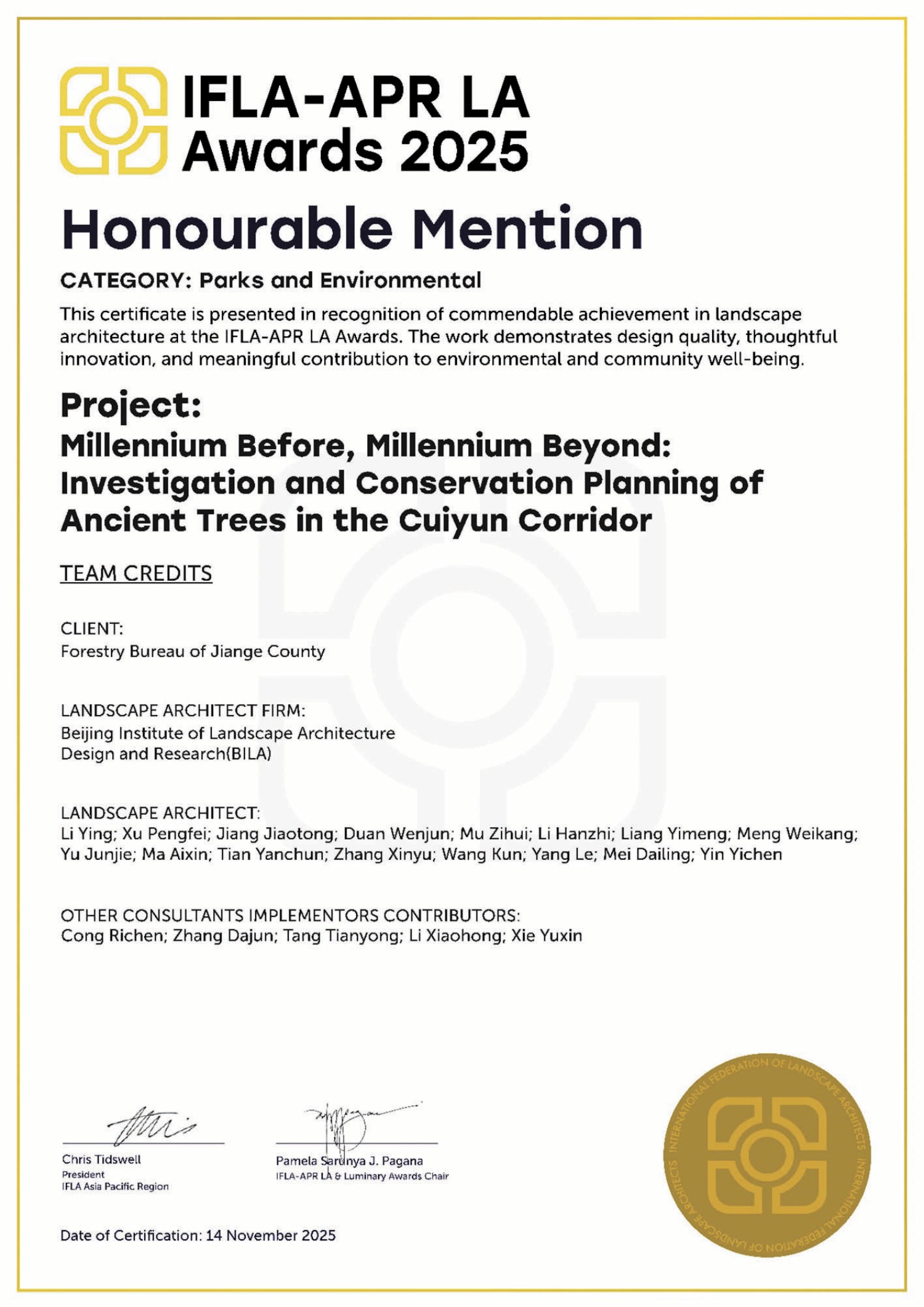 《剑阁古柏保护规划》获国际景观设计奖