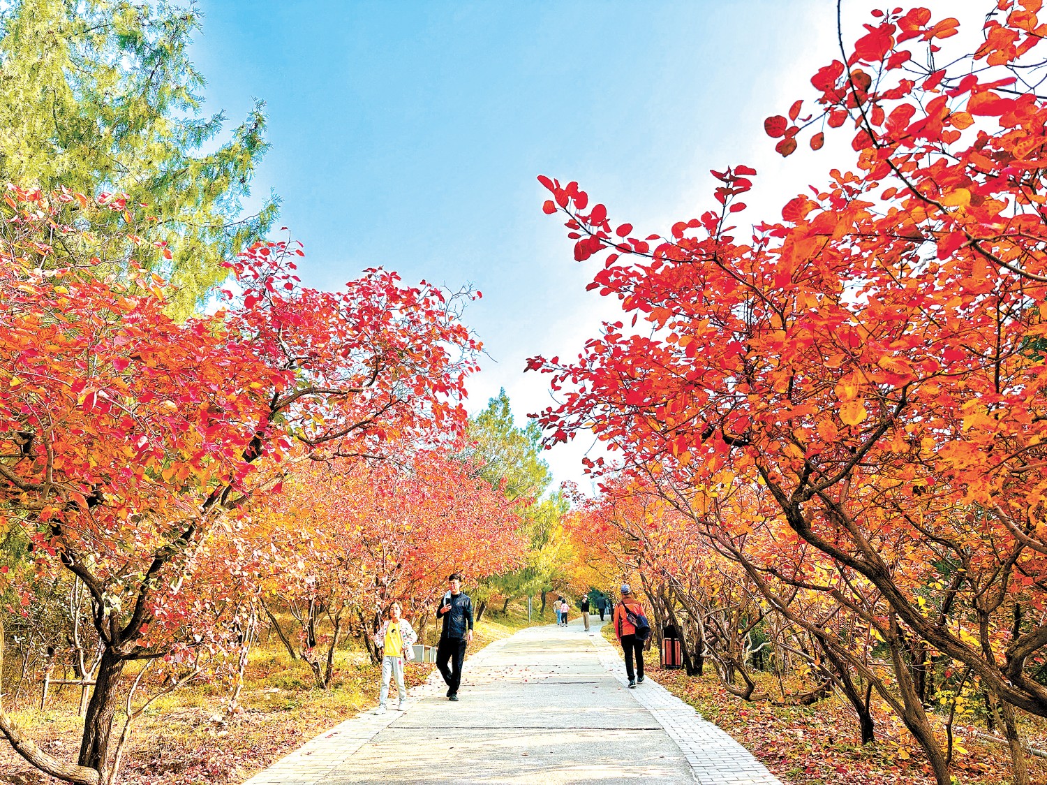 据百望山森林公园管理处工作人员介绍,园内栽植有黄栌、元宝枫、银杏、栓皮栎等本土树种,更引进丽红元宝枫、秋火焰、秋日梦幻等彩叶品种,共计10余种彩叶植物开始逐步进入最佳观赏期,山间呈现红叶流丹、翠色点缀、漫山炫彩的多层次景观,预计可持续至11月中旬。(尚文博)
