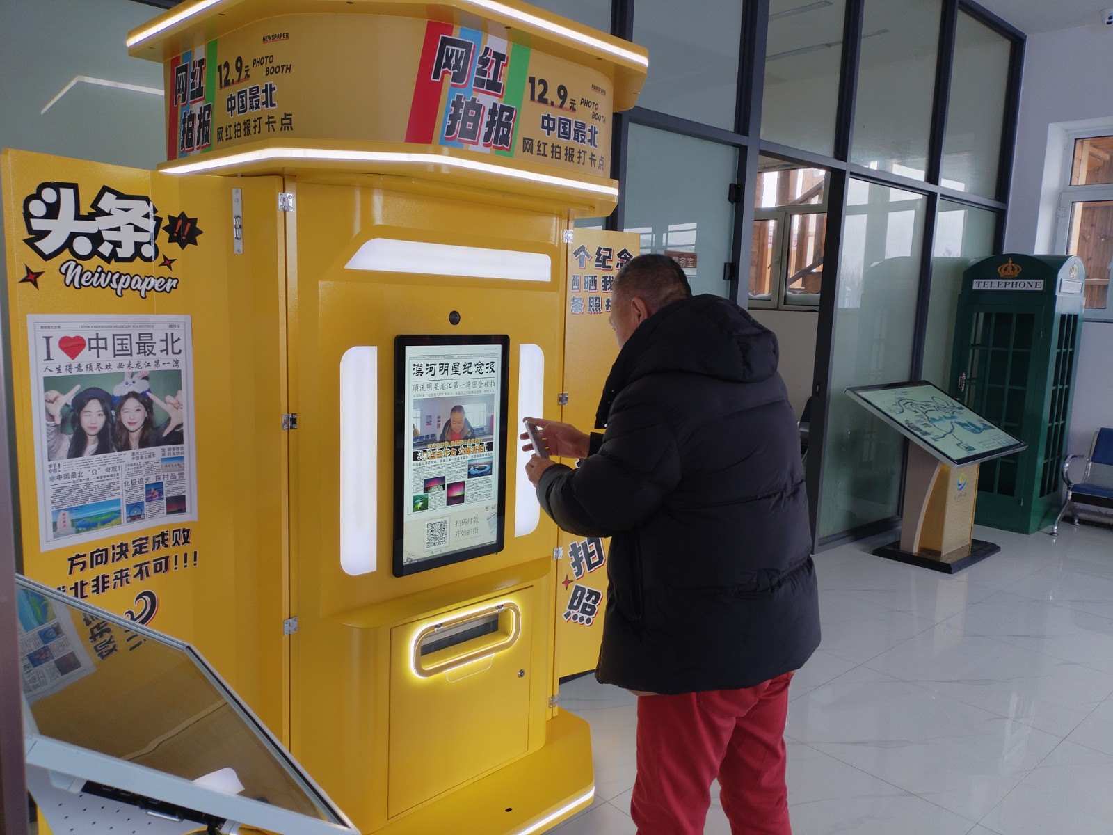 为提升游客互动体验,景区在服务区新增智能拍报机。该设备集成了全景拍摄、即时打印功能,游客可一键生成带有“龙江第一湾、中国最北点”地标的纪念照片报纸,并通过扫码获取电子版。拍报机内置多套冰雪主题滤镜,能自动适配雪景、极光等不同场景,满足游客个性化需求。