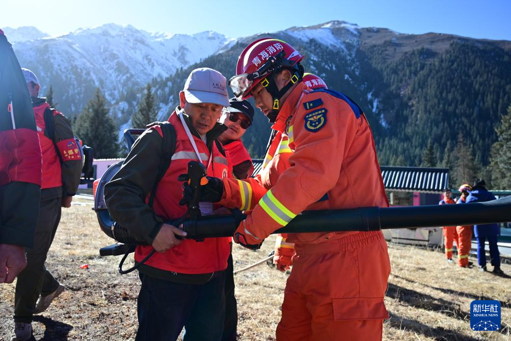 11月8日,在青海省海北藏族自治州祁连县阿咪东索林区,祁连县消防救援大队消防员(右一)指导当地护林员使用森林草原灭火救援装备。