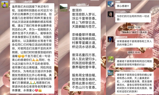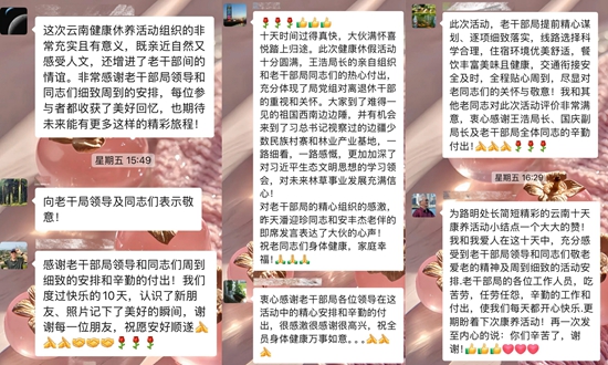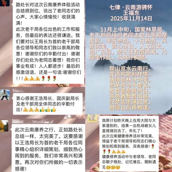 健康休养活动是落实离退休干部“两项待遇”的创新载体,多年来备受离退休干部青睐。此次普洱健康休养活动得到了亚太森林组织普洱基地和自然资源部中国山水旅行社的大力支持和积极配合,赢得老同志们一致好评。大家纷纷表示,在普洱的生态画卷中放松了身心、增进了交流,既领略了“城在林中、林在城中”的宜居之美,见证了生态文明建设的丰硕成果,更深切感受到国家林草局党组对离退休干部的关怀和温暖。大家今后将持续保持健康向上的精神状态,尽情体验美好生活,主动发挥余热,为党和人民的事业、为林草工作高质量发展不断增添正能量。