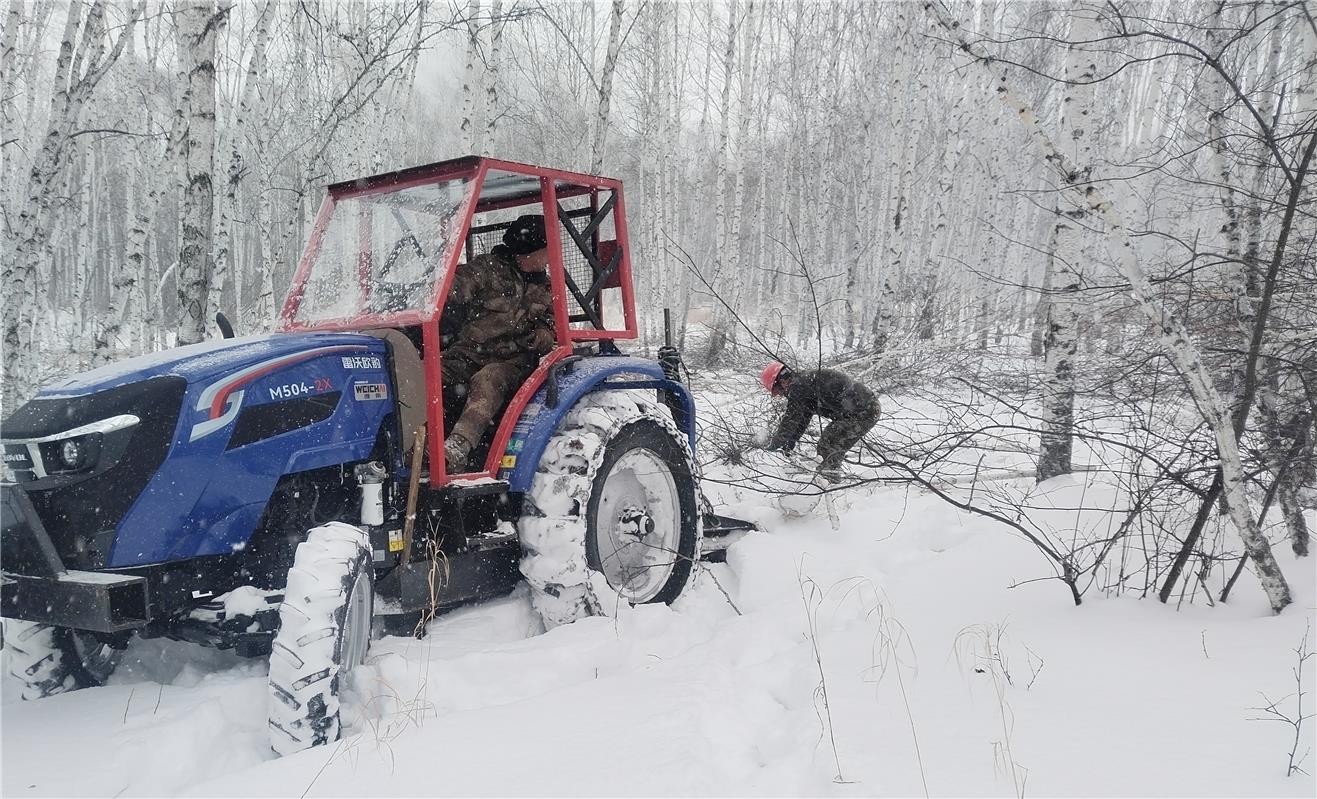 现场虽寒风裹雪、冻得人脸颊生疼,各环节却紧张有序。老员工裴学峰紧握油锯,对准森调队员预先标注的蓝色漆点清除木精准下锯,树木顺着预设方向平稳倒地;不远处,打枝人员在积雪里熟练剔除枝桠,集材拖拉机司机将伐倒木绞集捆扎后转运至指定车场,清林工人同步归拢枝丫形成横山规范堆垛,从打枝到集材、清林、运送,全流程衔接高效、忙而不乱。