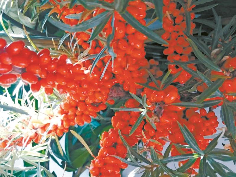 沙棘的果实维生素C含量极高,素有维生素C之王的美称。黄橙橙红艳艳的沙棘果缀满枝头。