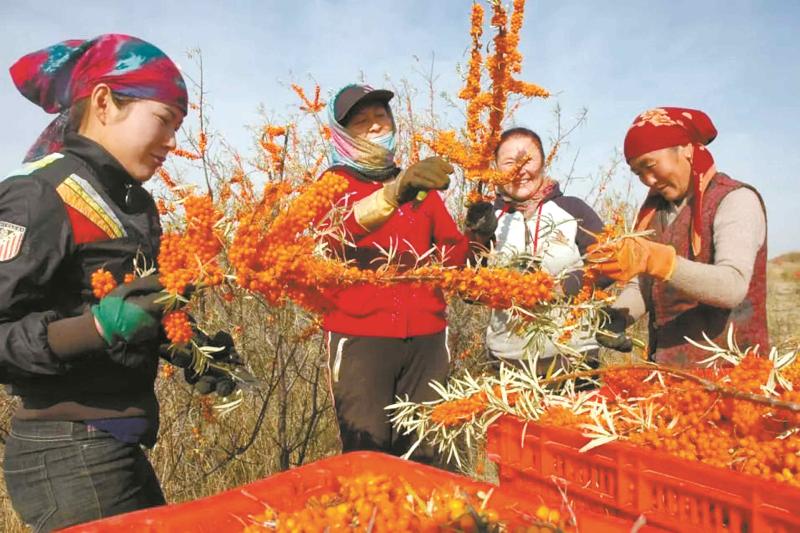 沙棘的种植和开发利用,推动了三北和西部贫困地区的生态经济综合发展,如山西吕梁革命老区,沟壑纵横,生态环境脆弱,是贫困地区。发展沙棘产业绿了山川,富了百姓。新疆古尔班通古特沙漠边缘的170生产建设兵团,所在地曾经是“风吹砂砾跑,遍地不长草”的戈壁滩,种沙棘把戈壁变绿洲,其出产的沙棘果成为沙棘国家地理标志产品。新疆乌什县,种沙棘把昔日风沙城变成沙棘之城,成为西部边陲脱贫致富样板。沙棘种植和开发利用作为国家援助西藏阿里项目,为当地打造了生态富民产业链,开辟了绿色脱贫致富路。(胡彩颜)